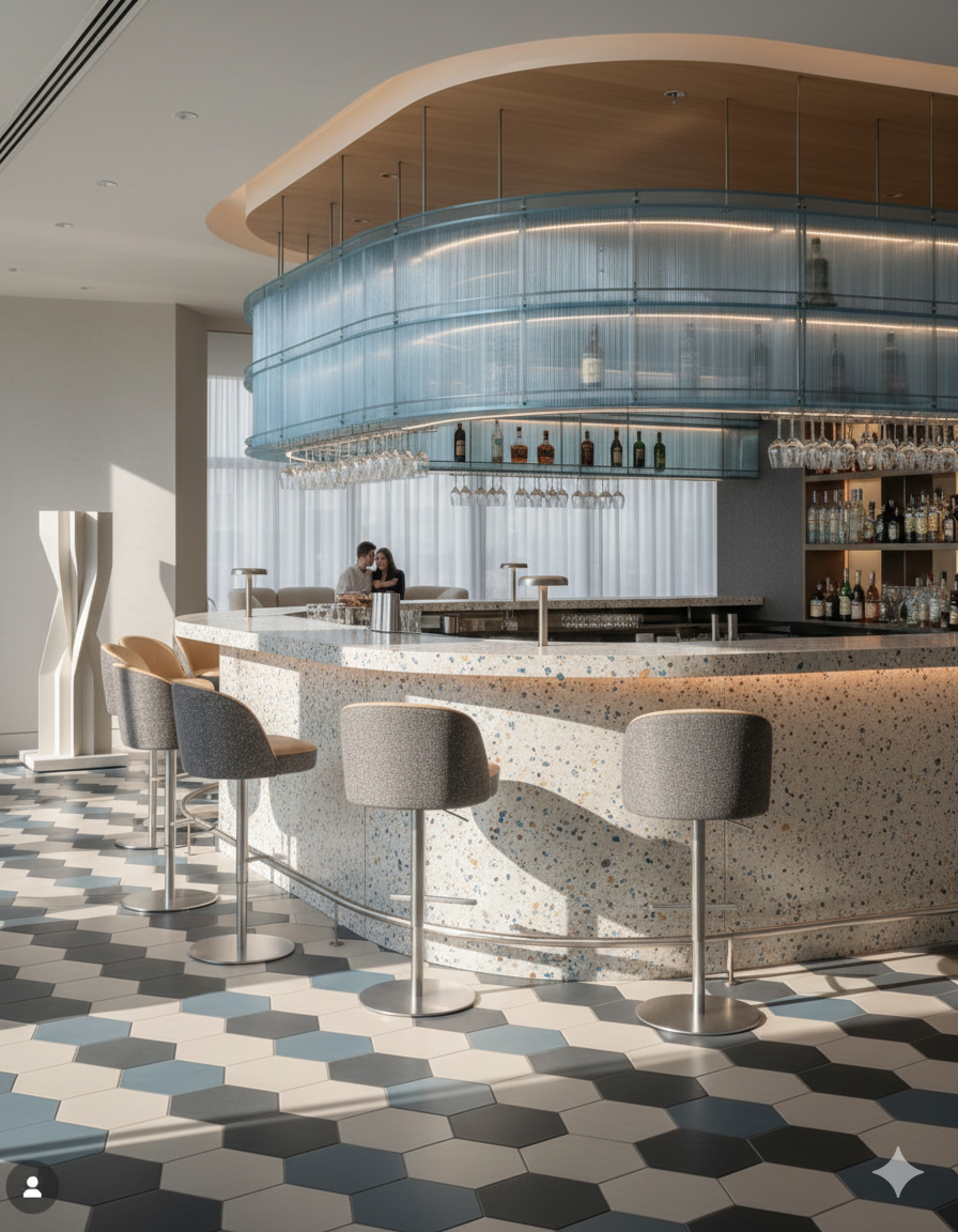 Architectural-grade materials made from recycled plastic for spaces traditionally defined by solid surfaces.